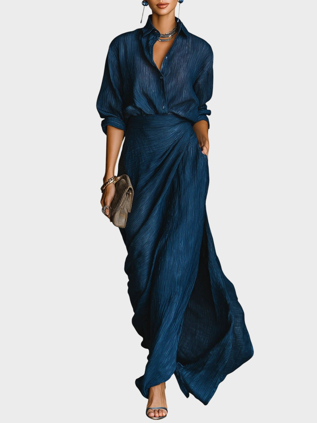 Anita™| Elegantný komplet košele a dlhej sukne zo zmesi bavlny a ľanu v tmavomodrej farbe